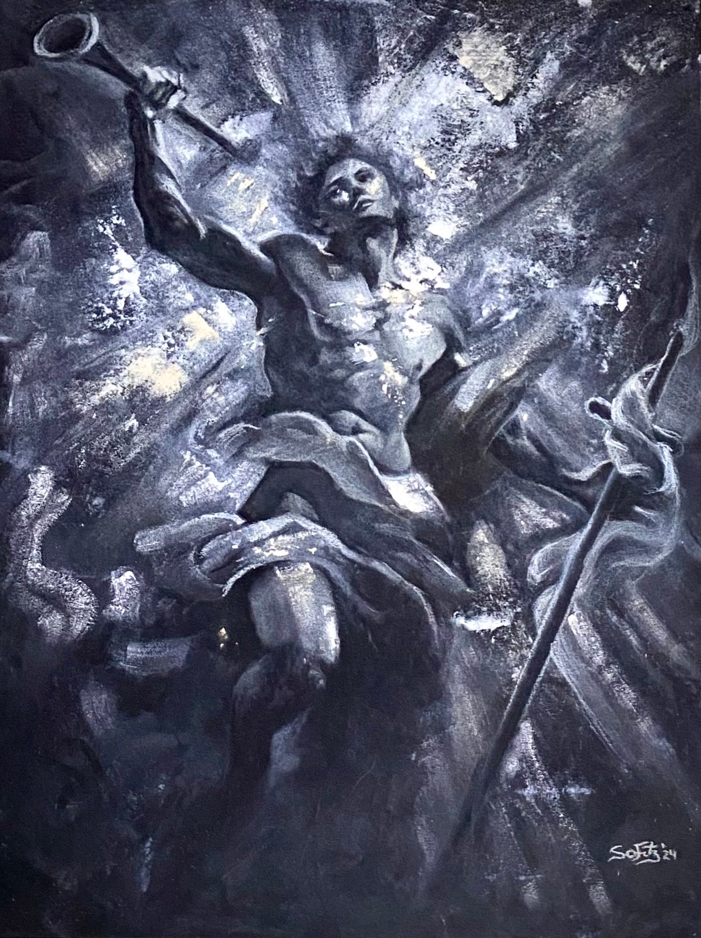 A beautiful, mounted giclee print of the powerful Archangel Gabriel breaking through the heavens to protect us from deceit. 9"x12" giclee print with .25" white borders