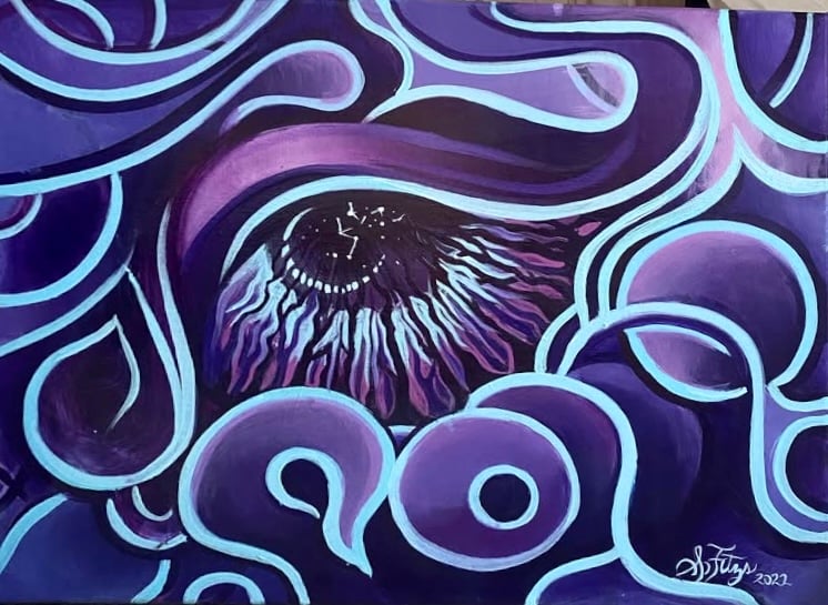 Take a glimpse into the night fractals through the bare trees. Deep reflection awaits! 11x14” acrylic on canvas