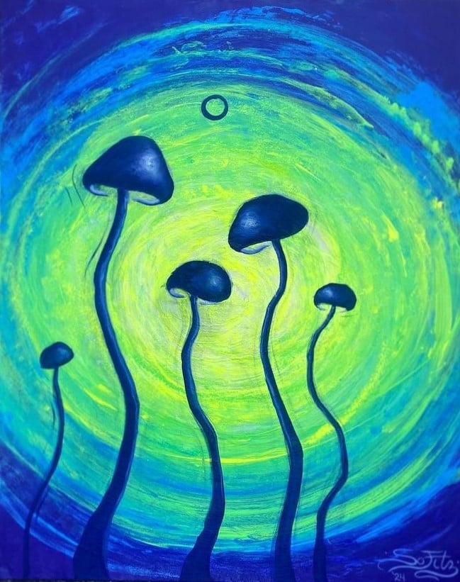 A family of fungi awaken to the call of the decadent forest night. Luminous dreams await, both in daytime and nighttime! 24x30", oil over acrylic.