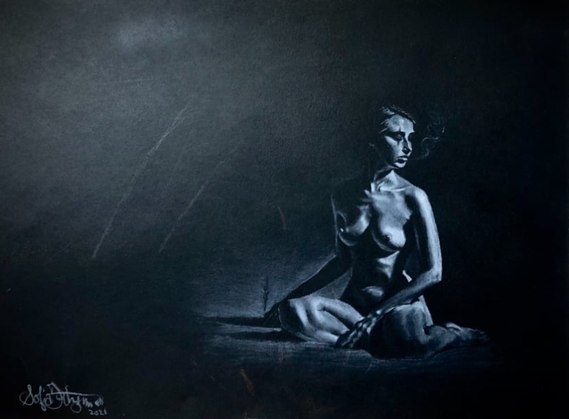 A hauntingly serene scene in the dead of night. The soft glow of the moon barely illuminates the black.