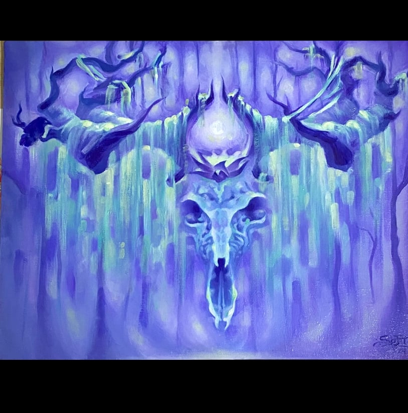 Using only pthalo turquoise, dioxazine purple, and a splash of ultramarine blue, a truly mystical, eerie scene is just barely distinguishable in the mist.