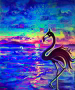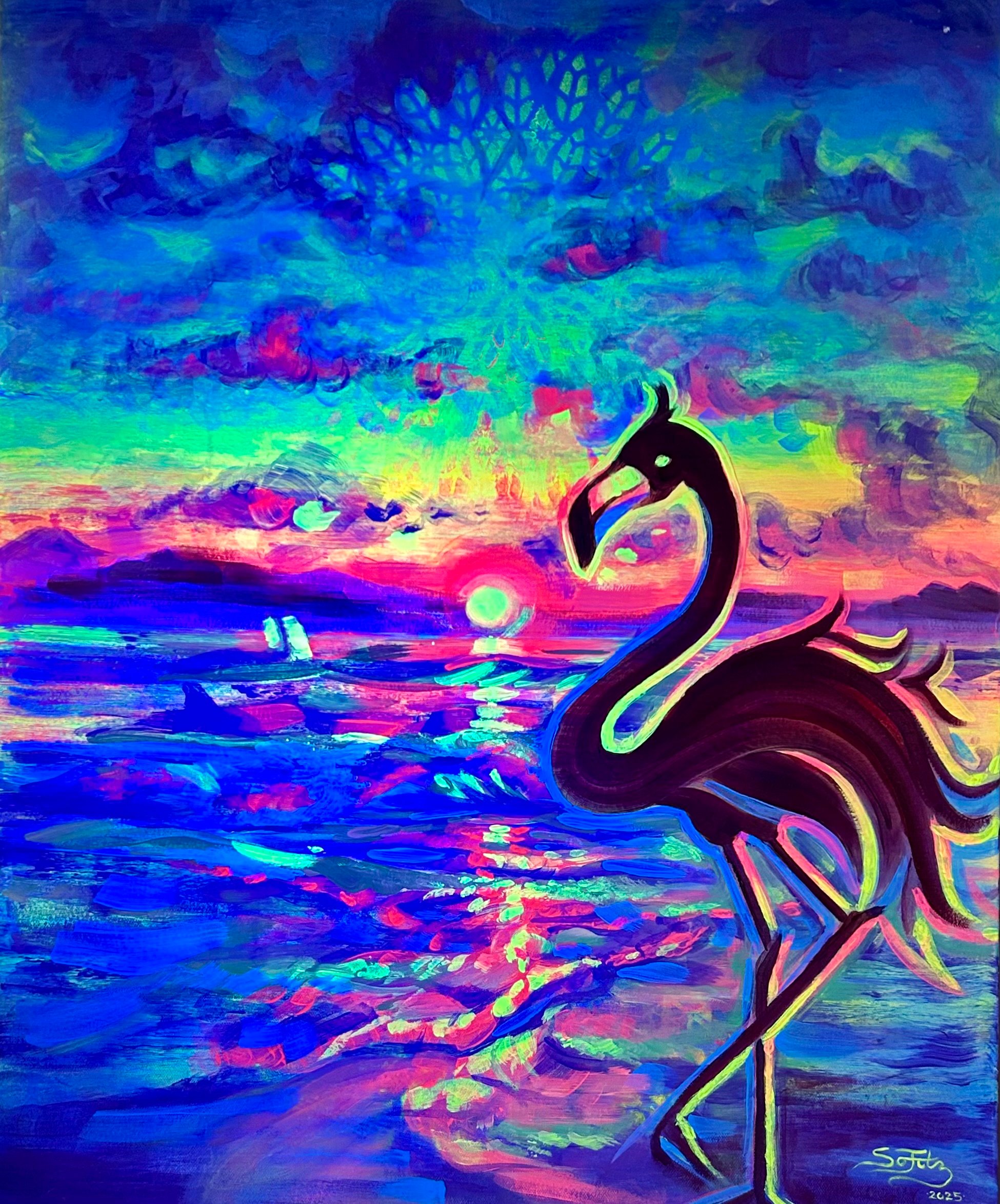 Striking beach sunset enjoyed by a funky flamingo. Painted with rich fluorescents, providing an equally festive daytime experience as well as a blacklight one. 24x30"
