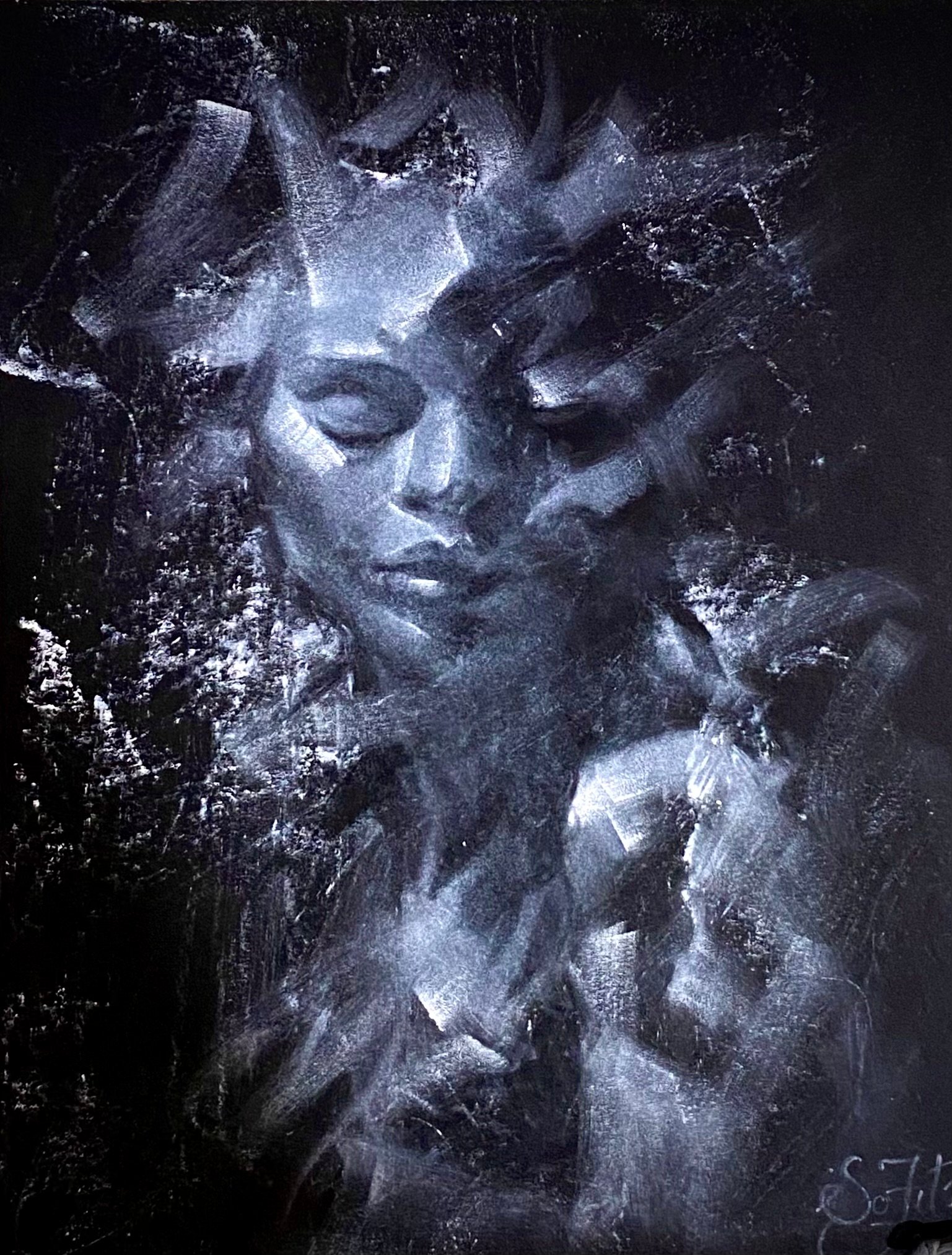 A striking depiction of ethereal meeting material, conveyed simply yet effectively using white chalk on black paper. 9"x12" Luster Print