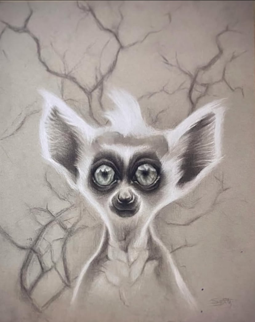 A delicate interplay between the softest of willow charcoals, white chalk and the smooth gray tone of the substrate beneath it all. Is that a hint of green in the eyes?